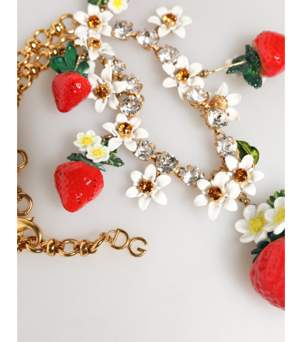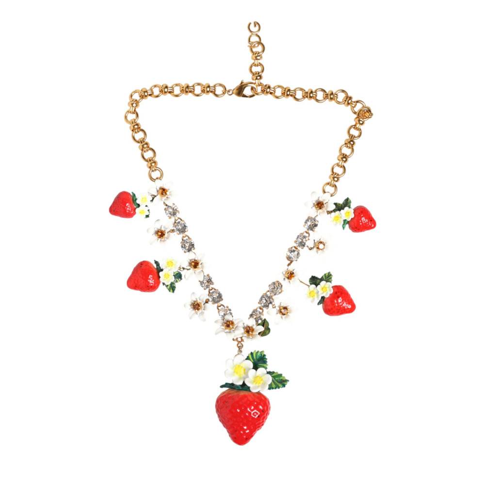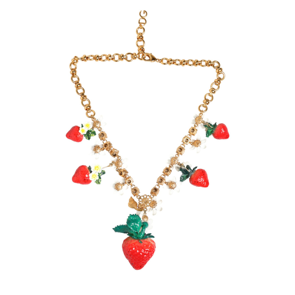 Impresionante, completamente nuevo con etiquetas y caja, 100% auténtico Dolce & Gabbana collar de latón con acabado dorado, decorado con encantadores colgantes de frutas y flores.
