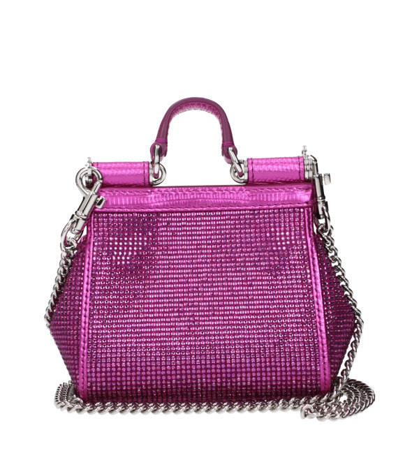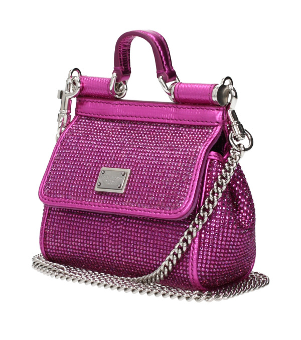 El producto con satén en fucsia es un bolso diseñado por Dolce&Gabbana. Tiene características como el logo frontal, cristales y correa de hombro removible.