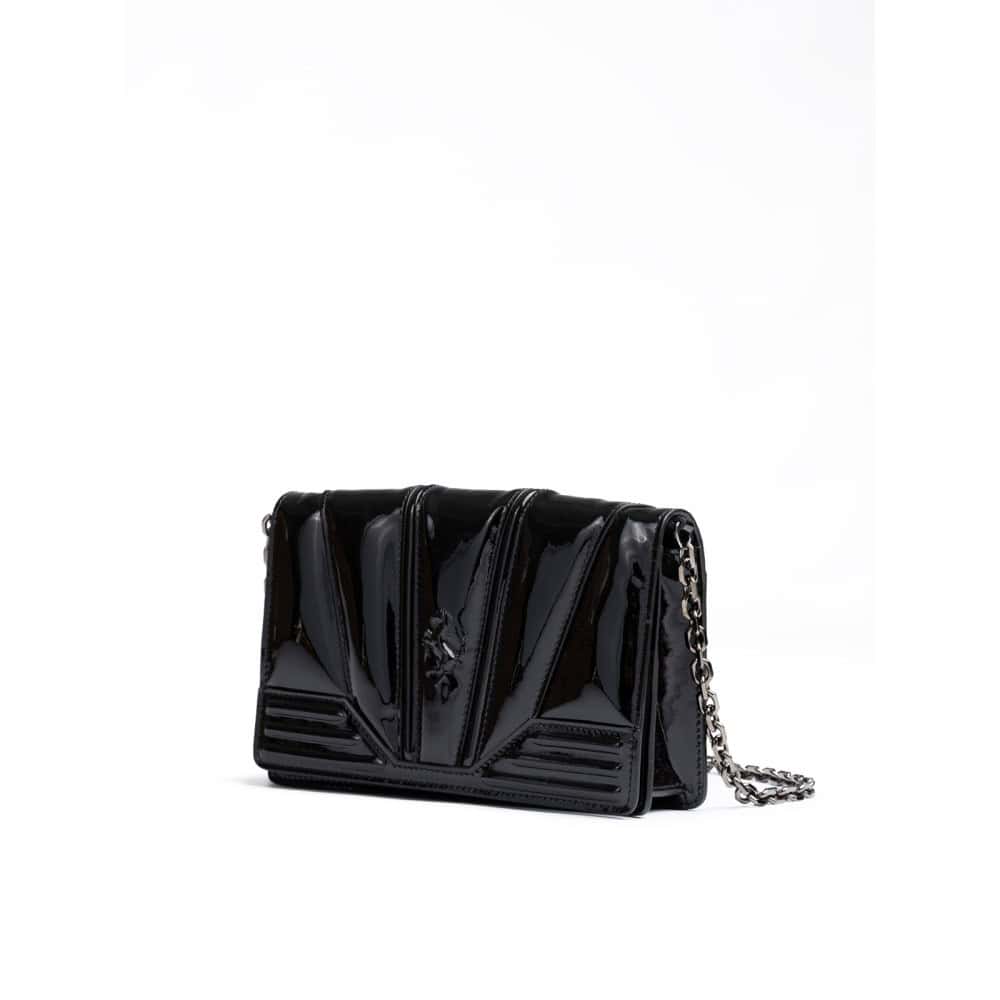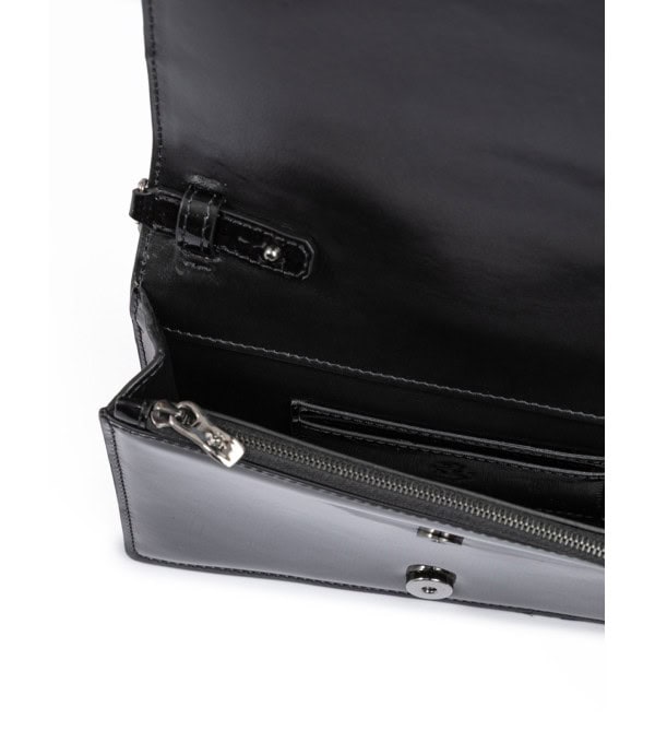 Modelo: Bolso de cuero patentado negro GT con cadena Impresión de alta frecuencia en la parte frontal Correa de hombro ajustable Bordes y costuras tonales Un bolsillo con cremallera 2 compartimentos para tarjetas Detalle del Caballo Reposando Metal con acabado en rutenio Dimensiones del chasis: 16 cm (H) x 21 cm (W) x 8 cm (D) Color: Negro 100% cuero de ternera La bolsa viene con bolsa de polvo de marca, sin etiquetas. Hecho en Italia.
