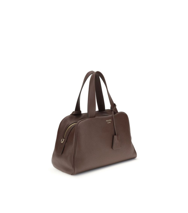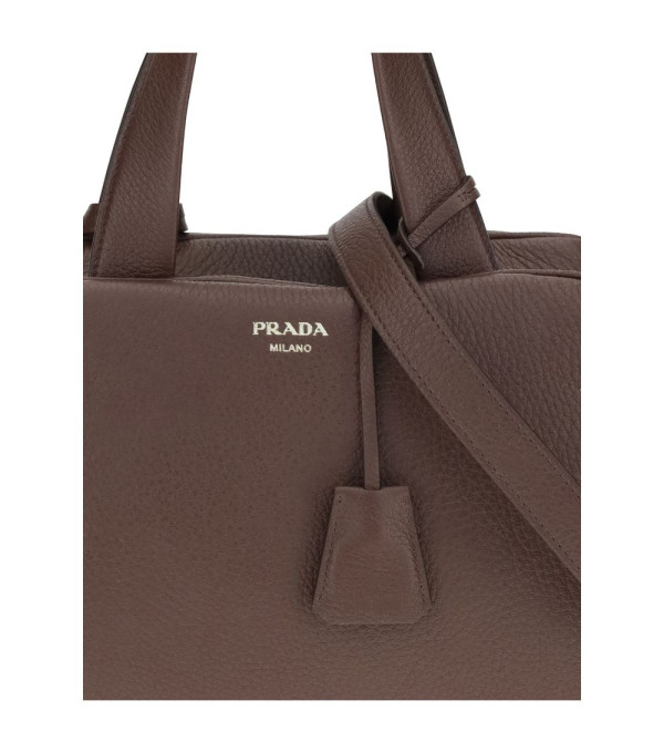 El bolso de cuero de Prada combina elegancia y versatilidad en un diseño sofisticado. Con un cierre superior con cremallera de doble cursor, cuenta con dos asas planas y una correa de hombro ajustable y desmontable para diferentes opciones de transporte. El icónico logo estampado en relieve en la parte frontal y el charm aplicado a la base del asa completan el modelo con detalles distintivos y refinados.